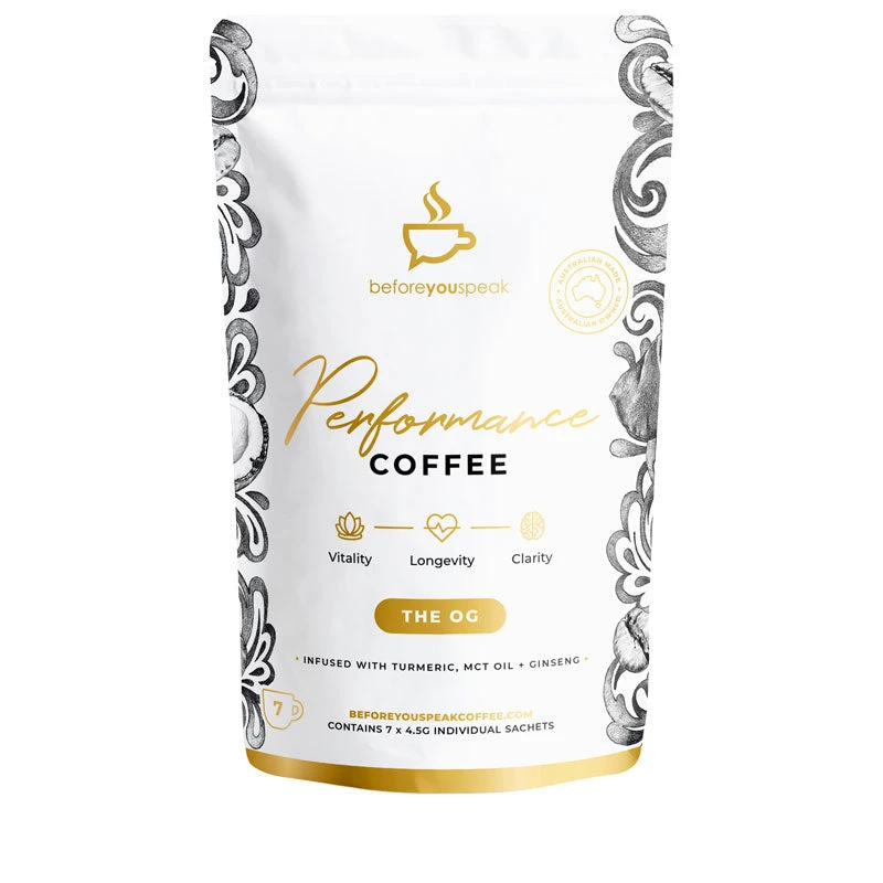 Supercharge your morning routine with a cup of Beforeyouspeak Coffee’s The OGÂ High Performance Coffee. This premium instant Colombian blend pairs MCT Oil, Ginseng, Turmeric, Green Coffee Bean, Black Pepper and Stevia Leaf to kick start your day. Includes 7 serves.