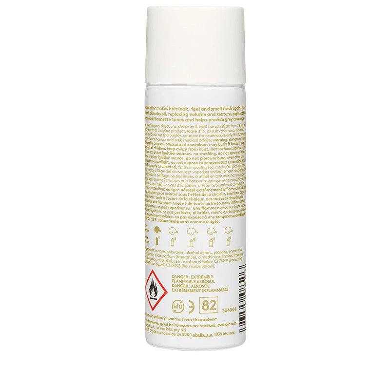 Instantly cleanse and refresh all hair types without any chalky residue with the evo Water Killer Dry Shampoo in Brunette. This two-in-one dry shampoo and styling spray works to quickly freshen the feel, look and smell of hair while replacing excess oil with effortless volume and texture. Ideal for all hair types and specially formulated for brunette hair, this dry shampoo is infused with dark pigment which blends with dark/brunette tones, providing grey coverage.