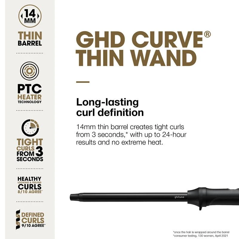 Designed with a seamless curling experience in mind, the ghd Curve Thin Wand Hair Curler creates long-lasting tight, defined and even curls quickly, with minimal effort, and no extreme heat. Ideal for all hair types, this styler works wonders in particular in long hair to transform straight hair to tight curls from root to tip. Ultra-lightweight, compact and ergonomic for added control and effortless curling at home, this professional curling wand with a 14mm thin barrel ensures defined, even and healthy-looking curls whatever your hair type and length. The 2.7m professional length swivel cord allows for greater styling freedom, allowing you to master the perfect style with ease. Featuring PTC heater technology with the optimum styling temperature of 185°C across the barrel, this innovative hair curler allows you to rapidly create tight curls from 3 seconds, achieving optimal ghd results and long-lasting curl definition with less damage. Hold the look for longer with ghd Curly Ever after and brush with the ghd Tail Comb.