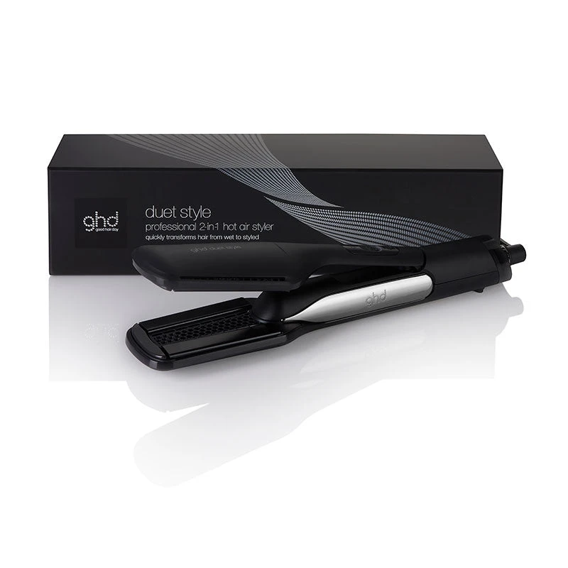 It’s styling but not as you know it. Introducing the ghd Duet Style – a first-of-its-kind, revolutionary 2-in-1 hot air styler that transforms hair from wet to styled with no damage, sizzling or burning smell. Suitable for all hair types, the duet style is sure to elevate your styling routine. The versatile styling tool allows you to create salon-worthy results without compromising on your hair’s health. Featuring Air-fusion technology along with a set of 4 smart plates that work in harmony to deliver and maintain the optimal styling temperature from root to tip, this innovative styler helps to transform your locks, delivering instant frizz-free results with 2x more shine. Each advanced floating plate is finished with an ultra-gloss coating to glide over hair smoothly and seamlessly from root to tip.Â